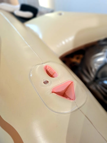 Tarni is the friendly shark girl, based on the anthro sand shark girl design by Kittell Fox. Our shark design blends her female appeal with the looks of a classic inflatable pool shark. This is a scaled-down "pooltoy" version of the original, custom-grade inflatable. Lil' Tarni is 210cm long when inflated. She has 3 chambers - body, and the two large side fins. The body valve is a soft-plug valve; the fins have standard beachball valves. Tarni is made of 0.28mm soft, pooltoy-grade material and screen-printed for use in the pool.